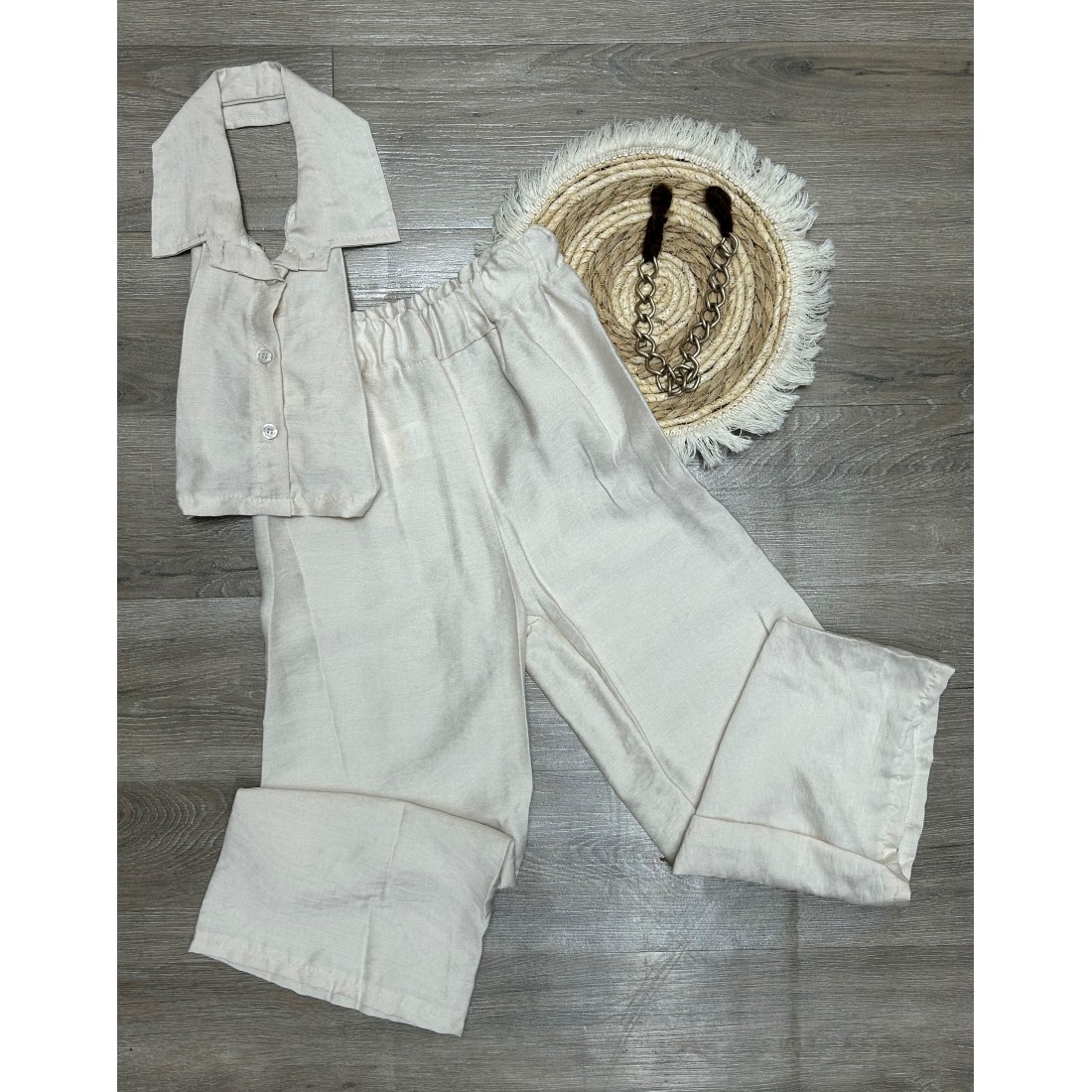 Λινό εκρού σετ δύο τεμαχίων. Crop top με δέσιμο στην πλάτη και γιακά. Παντελόνα με λάστιχο στη μέση. Ιδανικό και για επίσημες εμφανίσεις.